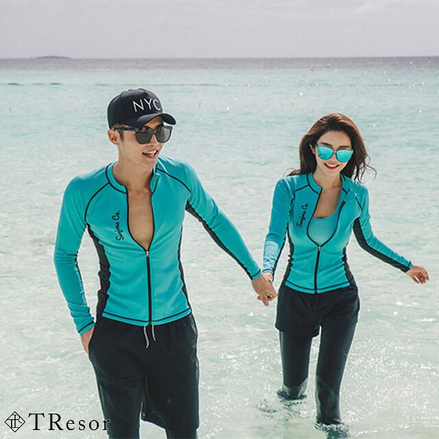 【即納】ペア水着 ペアルック カップル水着 レディース ワンピース 体型カバー 長袖 セットアップ オールインワン セット バイカラー フィットネススタイル 日焼け防止 UVカット UV対策 紫外線対策 プレゼント お揃い メンズ水着 男性用 ビーチパンツ サーフパンツ 男女 温泉 ハネムーン 海外旅行 新婚旅行