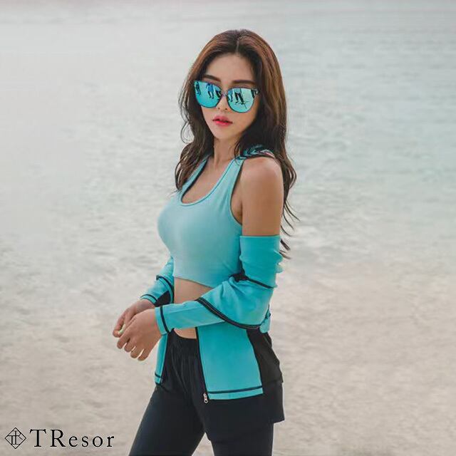 レディース;長袖ラッシュガード、ブラトップ、短パン、レギンスの4枚セット