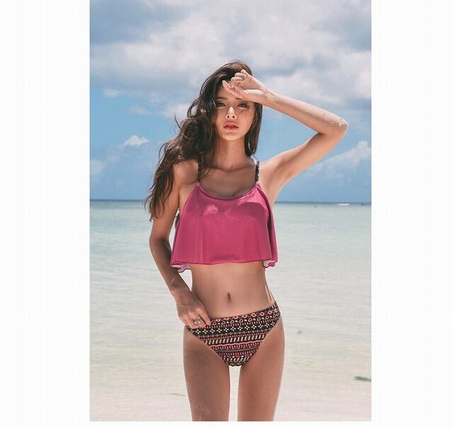 ラッフルビキニになっているので、胸元にボリュームを与え全体のスタイルを整えてくれます。