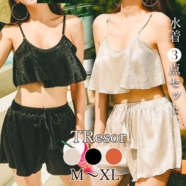 光沢感のあるフリルの可愛いタンキニ水着 3点セット